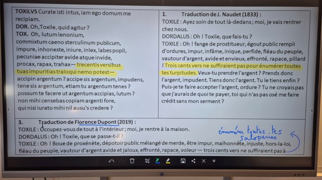 Le texte étant plus long que les précédents, les élèves ont d’abord dû retrouver le texte latin correspondant aux passages en gras signalés dans la traduction. Puis nous avons reconstitué une traduction juxtalinéaire ensemble. Nous avons retrouvé des faits de langue déjà rencontrés dans d’autres genres littéraires comme l’usage des pronoms, l’interjection, l’insulte…