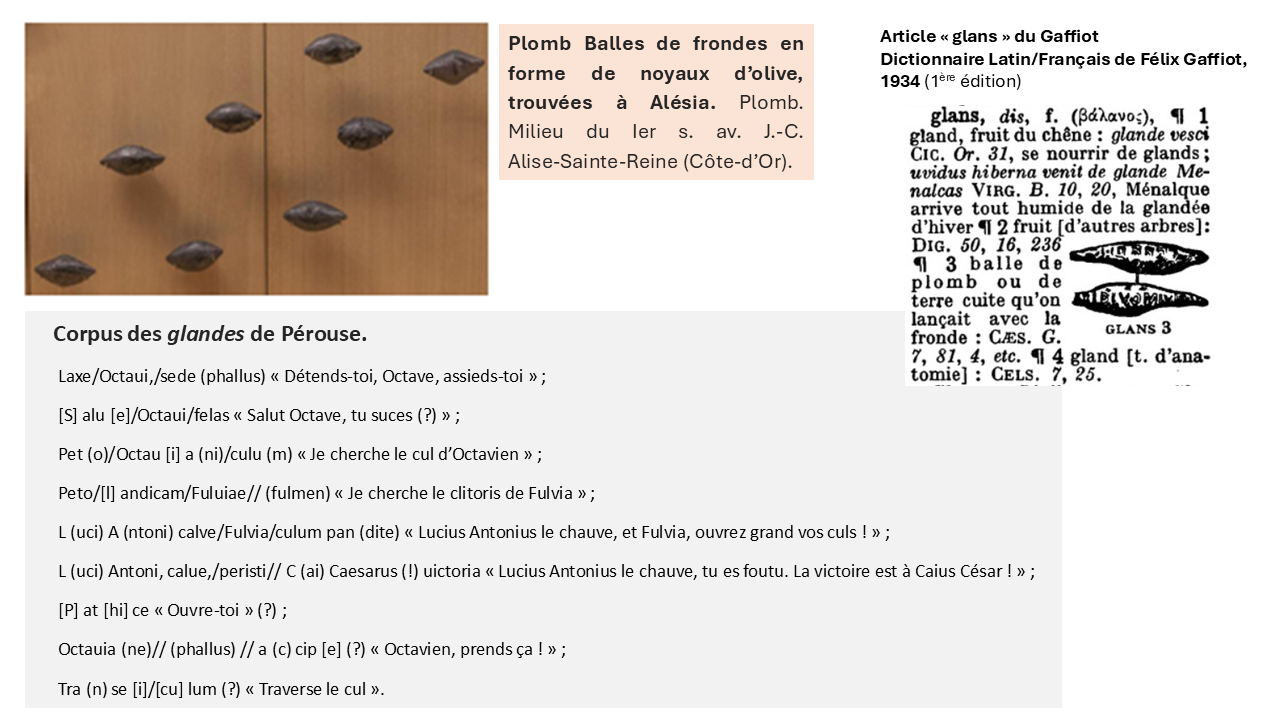 Sur les glandes plumbeae, balles de frondes en forme de gland, on gravait les insultes à destination des ennemis, faute de pouvoir les proférer en face à face. Le corpus ci-dessous (Cf. exemplier VII-3) propose des insultes modérées, pourrait-on dire, comme « Lucius Antonius le chauve », mais aussi des insultes particulièrement triviales et salaces. La polysémie du mot glans « gland » lui-même, en latin comme en français, les favorise.