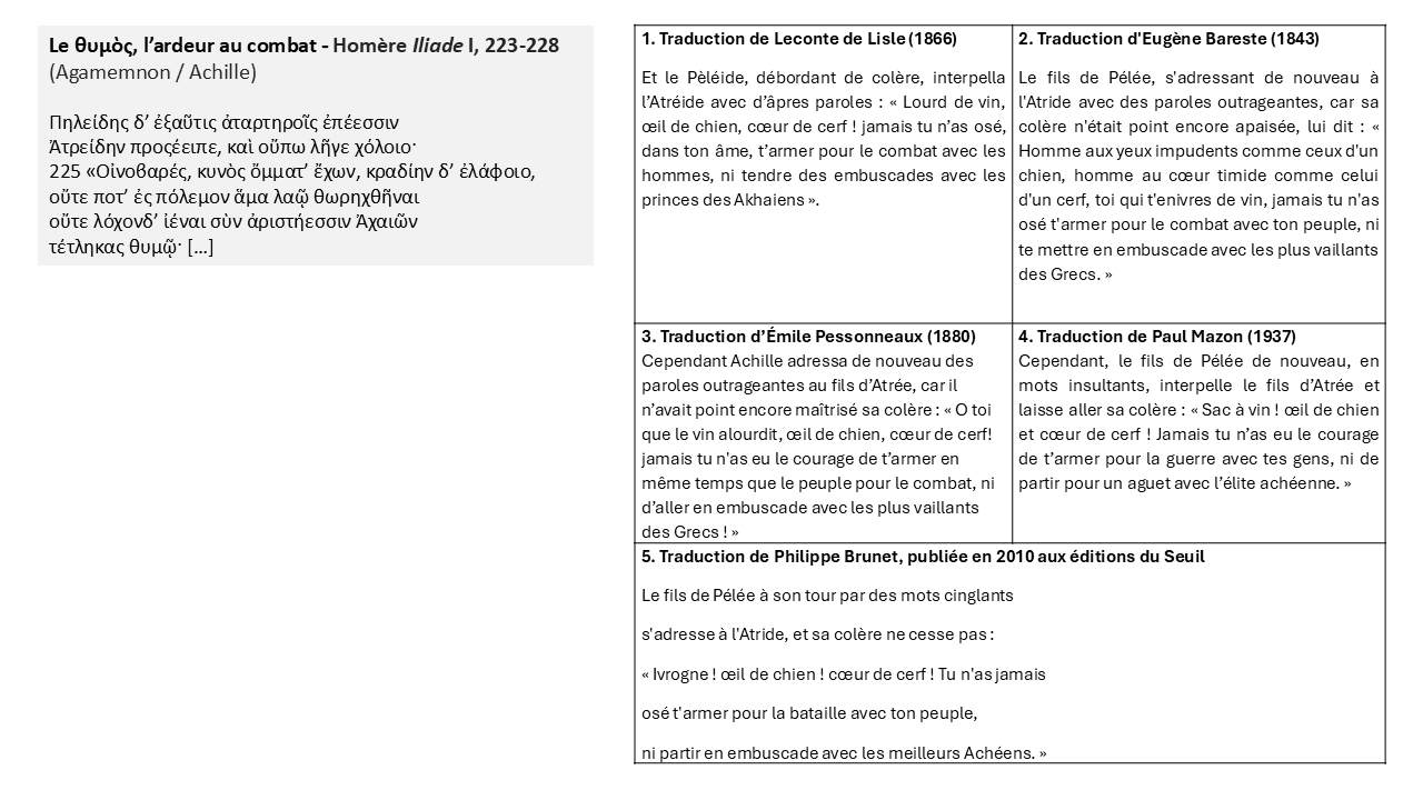 Dans le texte homérique Iliade, I,223-228 (Cf. exemplier VII-1), nous retrouvons comme nous l’avions observé dans la comédie des termes provocants et insultants. Cette fois-ci, cependant, il ne s’agit plus de faire rire, mais de combattre.
