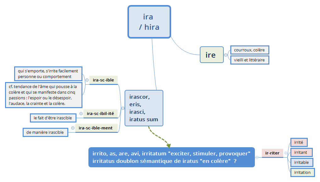 Or "irriter" issu de "irritare" est d’abord attesté en français au XIVe siècle dans le sens de "mettre en colère", et seulement au XVIe siècle dans le sens, pourtant étymologique, d’ "exciter, pousser quelqu’un à" / "rendre plus vif " exciter la douleur". Par ailleurs, les occurrences latines iracundiam irritare Sénèque De Ira 3, 8 et iras irritare Tite Live 29,16,5 témoignent bien de liens sémantiques entre ira et irritare. Un phénomène de confusion étymologique à un moment de l’histoire de la langue n’est pas exclu. [2].