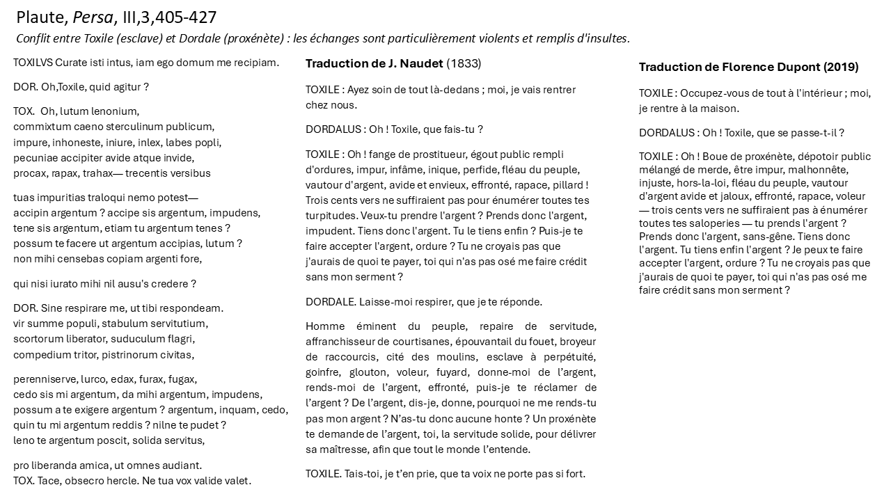 Le deuxième texte, extrait de Persa, Plaute III, 3, 405-427 (Cf. exemplier IV-2), nous intéresse pour ses énumérations d’insultes et leur traduction.